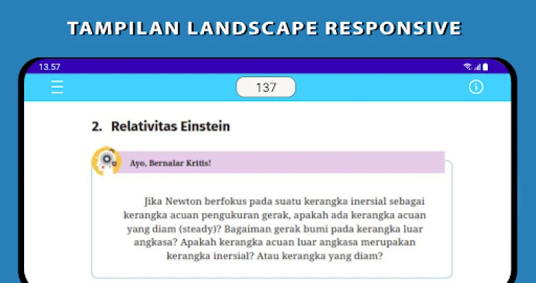 Dirancang dengan antarmuka yang ramah pengguna, navigasi melalui setiap bab dan sub-bab Fisika menjadi sangat mulus berkat fitur tautan langsung. Pengguna dapat menikmati pengalaman membaca yang nyaman dengan tampilan responsif, memungkinkan pembesaran detail penting dan fungsi *zoom in/out* yang presisi untuk fokus pada rumus atau ilustrasi. Mode lanskap minimalisnya dirancang untuk memaksimalkan ruang baca, sementara fitur pencarian halaman memastikan Anda dapat menemukan informasi spesifik dalam hitungan detik. Semua ini berpadu untuk menciptakan lingkungan belajar yang efisien dan personal.