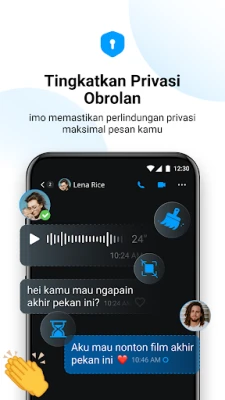 Sebagai pusat perpesanan multifungsi, imo Messenger memberdayakan Anda untuk tidak hanya bercakap-cakap, tetapi juga berbagi dunia Anda. Kirim foto, video, pesan suara, atau berbagai jenis dokumen seperti .DOC, .PDF, dan .MP3, semuanya dengan kualitas asli. Seluruh riwayat percakapan dan berkas Anda secara otomatis tersimpan aman di imo Cloud, membebaskan ruang penyimpanan di perangkat Anda. Privasi obrolan Anda adalah prioritas utama. imo melengkapinya dengan fitur canggih seperti enkripsi end-to-end, pesan menghilang, perlindungan layar, dan kemampuan untuk mencegah tangkapan layar, penyalinan, atau pengunduhan, memastikan setiap percakapan pribadi Anda tetap terjaga kerahasiaannya.