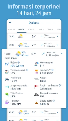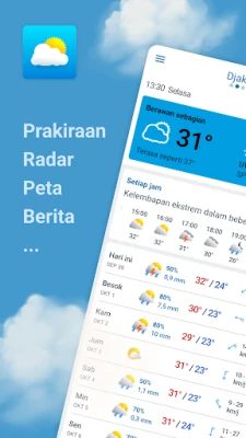Selami fitur interaktif dengan radar hujan canggih yang menampilkan presipitasi berakurasi tinggi. Peta cuaca kami menyajikan berbagai lapisan prakiraan seperti suhu, hujan, salju, dan tekanan atmosfer, lengkap dengan animasi partikel yang mengungkap arah angin dan gelombang. Anda juga dapat menelusuri citra satelit hingga 12 jam ke belakang. Keamanan Anda adalah prioritas; terima peringatan resmi BMKG untuk Indonesia dan penyedia lain di seluruh dunia, memberi Anda notifikasi instan tentang kondisi cuaca ekstrem. Informasi kualitas udara terperinci, kelembapan, dan data relevan lainnya membantu Anda membuat keputusan bijak terkait aktivitas luar ruangan dan perlindungan kesehatan, terutama bagi penderita alergi.